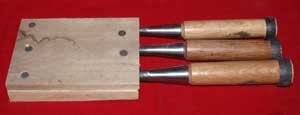 The part that holds the chisels is the same as the upright part of a rigid rack. The most important feature of this piece is that the chisel should not touch the bottom of the slot. In most shops, grit will accumulate in the bottom of the slot and nick the chisel edge if it is allowed to touch it.
