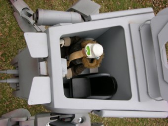 The walker is 42″ Tall x 38″ wide x 32″ deep. All the joints in the legs are articulated and the head moves. The windshield covers close and the top “gunner’s hatch” opens and closes. The interior is semi finished and has adjustable seats (thanks to Velcro) for different sized figures. The body is mainly made from old 2×4 cutoffs.