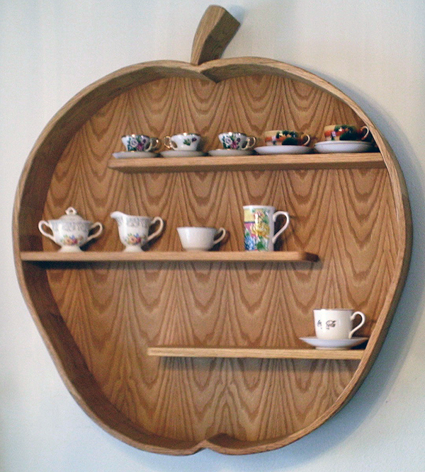 I’ve attached a photo of a wall shelf that was a challenge for me.  Some years back, my daughter-in-law requested an apple shaped shelf.  It measures about 3 ft. in diameter. I started by drawing an outline of an apple on paper. Next I bevel-cut short pieces of 1 x 6 so I could glue them together to make a rounded shape. I laid the pieces on my paper outline so that as I glued each piece it was always wider than my outline. I glued each half of the apple together separately. Using my bandsaw, I cut the inside and outside of each half according to the outline on my paper. Joining each half was a challenge, because each joint ended up being a compound angle in order to fit perfectly. I was never sure throughout the whole process if I would be successful. Finally I added the back, a stem and shelves. – Norm Riediger