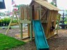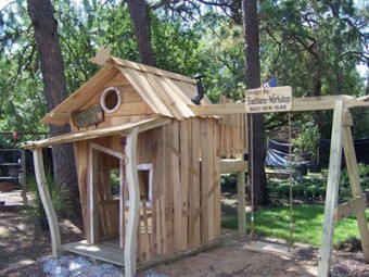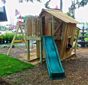 Sometimes you can get busy doing something you enjoy and get carried away. I was asked to build a play house with a swamp theme and found this to be the perfect combination for my craftsman skills and theater set designing experiences. Lots of fun! Hope I get to build more play houses / swing sets. (Yes, that’s me testing the slide.)