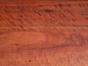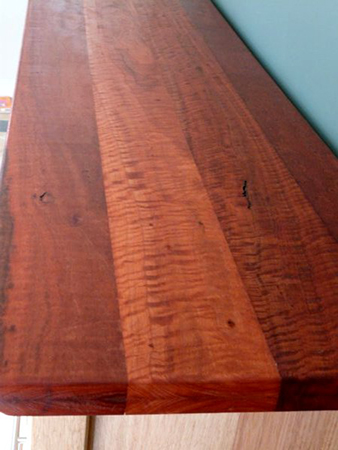 For the Redgum top, I had a chat with the boys at the lumber yard and had them keep an eye out for any boards coming through with fiddleback grain. The photos don’t do it justice but the grain gives an almost 3-D appearance of wavy tiger skin. Beautiful stuff. Finished off with a couple of coats of Danish Oil (a great Australian product called Organoil) and a wax and polish.