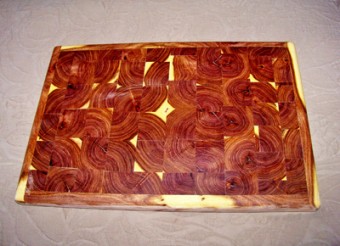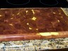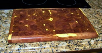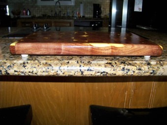 After seen a cutting board from a reader, I thought some might like to see the cutting board I made for my daughter. It is made of mesquite blocks bordered by mesquite boards all from the same limb from a friends ranch in south Texas. Put rubber feet on it and used Howards Cutting Board Conditioner. Turned out nice I think.