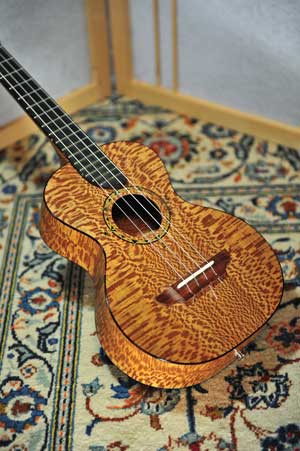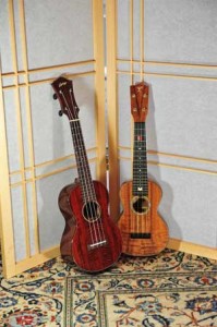 As the knowledge of my collection has spread though the ukulele universe, I often get calls from musicians and enthusiasts who want to come check it out. One recent visitor was a Mandalyn May, a performer from eastern California (near the gold country), who is both a wonderful singer and uke player. Her quest was to find out how different ukuleles sound, depending on the kind of wood they’re built from. The reason was that a luthier was going to build her a custom instrument, and she didn’t know what kind of wood best suited her. I must admit that I hadn’t really given this subject that much thought, even though I’ve been playing the uke for more than four decades.