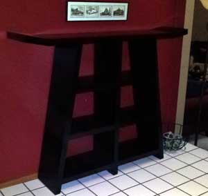 Well, my wife insisted that I build her a bookcase based on a Japanese theme or design. So I dreamt up this item which is based on a Torii gate. All the angles were cut with the saw blade set at 10 degrees except for the ends of the top piece which were set at 5 degrees. A bit of a challenge for a pure amateur like myself but my wife is happy. Nothing else matters!