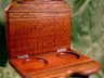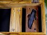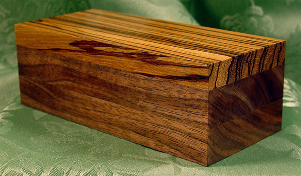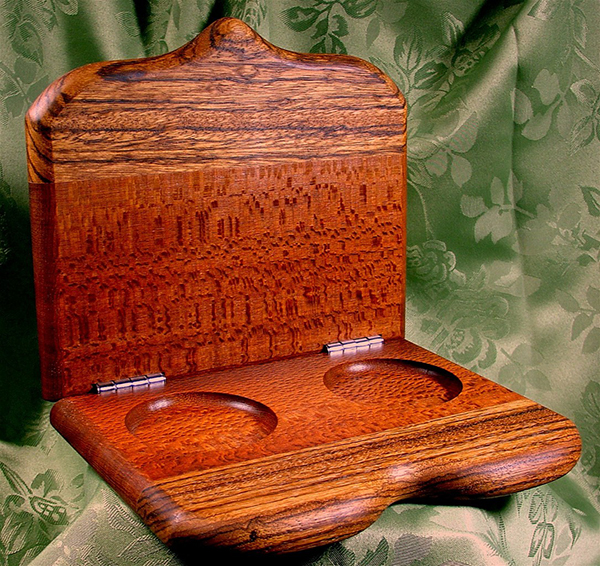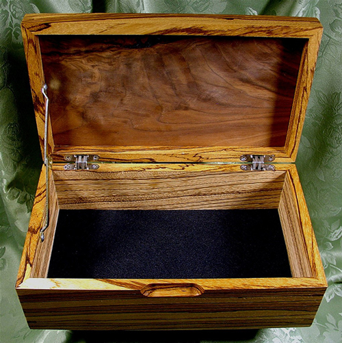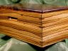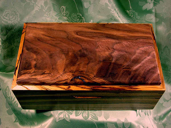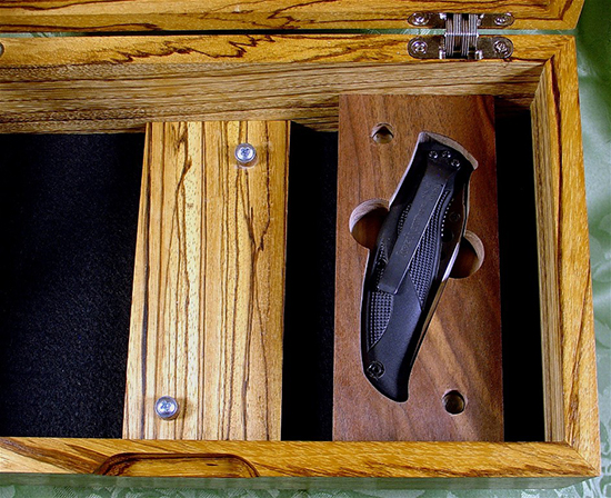Here are some anniversary gifts I made for my in-laws. A tostonera (for flattening out fried plantains) made from lacewood and zebrawood and finished with mineral oil and beeswax. Also, a jewelry box made from zebrawood and walnut, finished with wiped on poly. Inside sat a smaller box with a gift knife. The lid on this box is held in place by rare earth magnets.