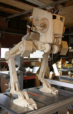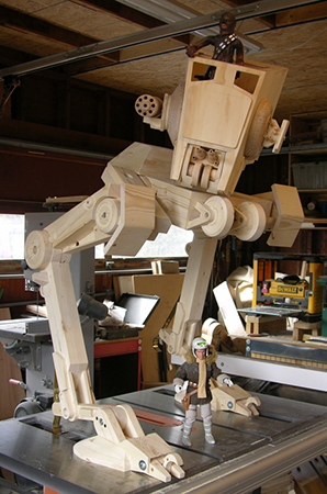I have been making doll furniture on and off for 12″ dolls since I was 16. Over the last few years I have had my to give up my profession as an architectural woodworker due to a back injury. Not wanting to lose my edge, I have gone into producing 1:6 scale furniture and structures as a way of hopefully returning to the trade of professional woodworking. I have been a Star Wars nut since the opening in 1977 and recently was edged on by my son to try to reproduce the AT-ST Scout walker from Return of the Jedi.