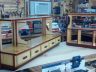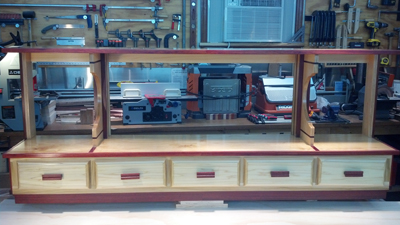 I built this trophy case for my granddaughter. It is wall-mounted with five drawers. I used Baltic birch, blood wood, and poplar. It incorporates many types of joinery. I finished it with Linseed Oil and Shellac.