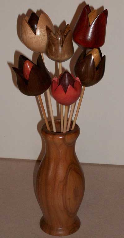 I turned the flowers out of different exotic and domestic hardwoods. Then turned the interior Bulbs from other different hardwoods. The vase was my own turning, it was done from a piece of Kiln dried Alabama Pecan that my father and I cut on our sawmill about three to four years ago. The reason for making this little project was a Valentines gift for my fiancee, I know women love flowers on that holiday, the only thing is that even though the flowers are pretty, they die a couple days later, hence this little project, Now she has flowers that will always be in bloom.