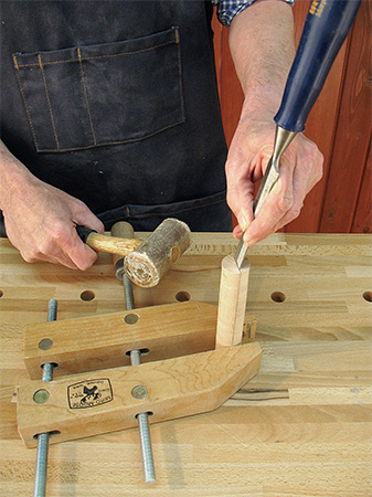 Remove the blank from the lathe, then stand it on end on a solid work surface and carefully position the cutting edge of a sharp 1″ chisel on the paper line. Strike the chisel, using gradually increasing force, to split the blank along the paper layer.