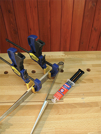 Quick-setting epoxy is a good adhesive choice for bonding the wood to the tongs. Wipe the excess off before it cures.