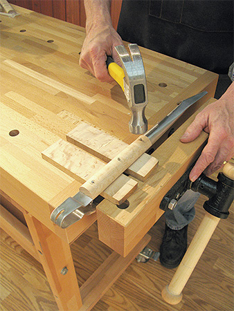 Drive the pins into their holes and then file them flush to the wood surface. Now sand and apply finish, and the tongs are ready to go to work.