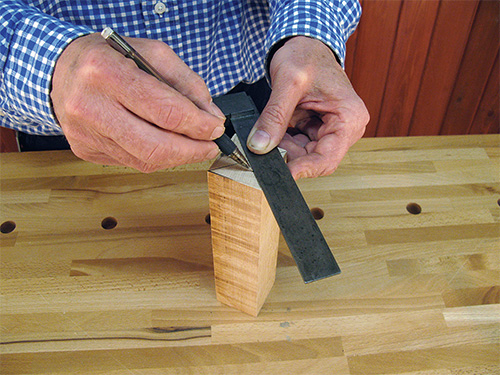 After squaring the ends of the blank to each other, mark the exact center of both ends. To do so, just draw an X from corner to corner.