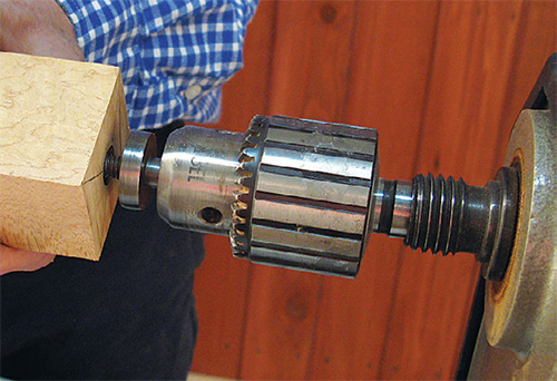 Remove the blank from the mandrel and, using an 11/32″ twist bit, carefully drill a 1-1/4″ deep hole centered on the tail end of the handle. The dimple left by the tailstock will locate the hole.