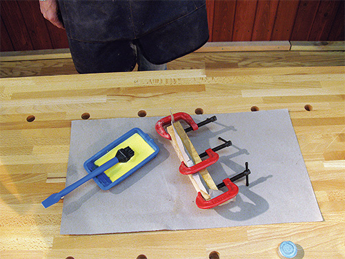 It’s time to mount the handles to the tongs. Rough up the mating surfaces of the metal and wood with sandpaper. Apply quick-set epoxy to one of the handle blanks and press it onto one side of the tongs, aligning the blank to the edges and tight against the curved shoulder. Wipe away any squeeze-out and clamp the handle until the epoxy cures.