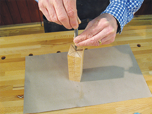 You’ll need blanks that measure 1-1/2″ x 1-1/2″ x 6″. Square up the ends, then mark them with diagonal lines to locate the center.