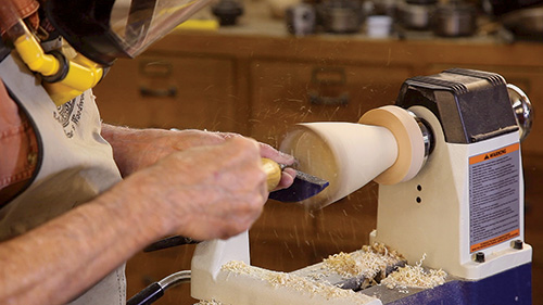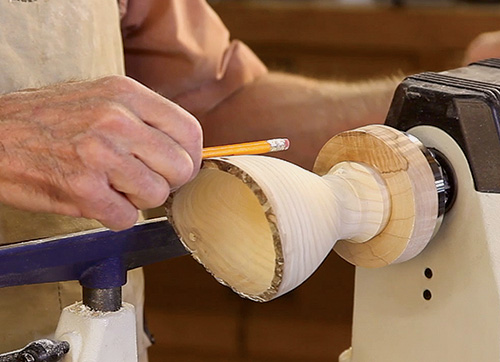 Turn the sides of your piece to a thin wall, in the range of 1/4″ thick. You can make this easier by shining a strong light on the left side, where you are cutting.