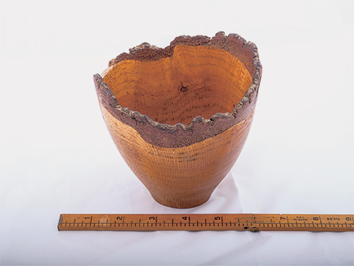 The author turned this average-sized natural edge bowl, with bark, from white oak. Well-meant but klutzy dusting resulted in the removal of the bark from a section: proof that natural edges are more art than utility. Turned green, the shape has warped to oval, but the natural edge largely hides this.