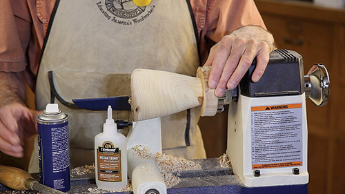 Sand the outside and now mount a 1-1/2″-thick glue block on a faceplate. In the glue block, scrape a straight-walled mortise that is a slide fit with the tenon. Scrape the area around the mortise flat so that the shoulder of the tenon on your bowl registers and brings the piece square.