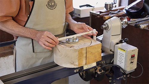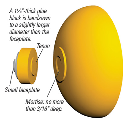 The outside of our bowl will be turned by direct attachment to a faceplate. We will then turn the bowl around and glue the freshly turned foot on a glue block: a 1-1⁄4″-thick disk of durable wood that is of slightly larger diameter than the faceplate. The thickness assumes that 1″ screws are holding the block to the faceplate. The 1-1⁄4″ thickness allows the bowl to be well above the screw tips.