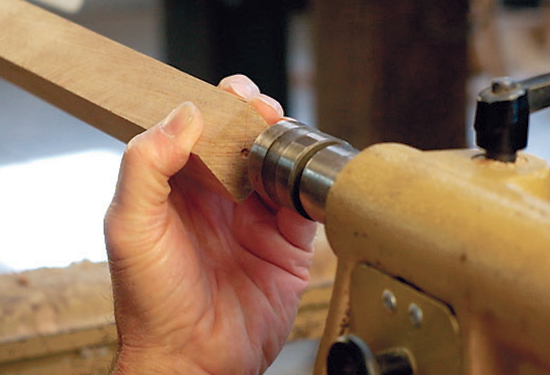 The problem with a long billet is that it is almost never straight. I overcome this problem by starting the lathe at 600 to 800 rpm and use a very sharp spindle gouge to just touch the work at the area where the steady will contact. I then turn the lathe off, examine which corners were cut, and move the tailstock center contact to bring the billet to where all four corners will be cut away equally. The work is now centered at the steady, and I turn it perfectly round at that place with a spindle gouge. If the work buckles too much, I resort to a big round-nose scraper to bring it round without catching — then engage the steady, and move the tailstock live center back onto the original exact center of the billet. The part can now be turned in the normal way.