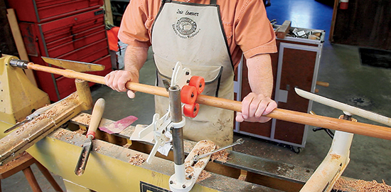 At some point when turning a long slender cylinder, you will go past your ability to control its vibrations while using your skew. That’s when a steady rest comes to the rescue. They are the solution to turning long, thin spindles. A number of good commercial examples are available, and plans abound to build your own.