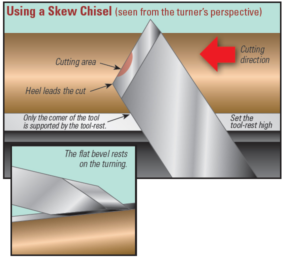 When you use a skew in a normal planing cut with a high tool-rest, as shown in the illustration above, wood removal happens in about half the cutting edge, biased to the heel. To work up to a shoulder, you must slide the tool forward slightly on the rest, all the while keeping the bevel running flat on the work, such that the tool cuts at the very heel. This is the heel cut, and it is also the only way to start on the end of a cylinder. It is the most vibration-free cut of any tool, and what you have to resort to when you encounter bad chatter.