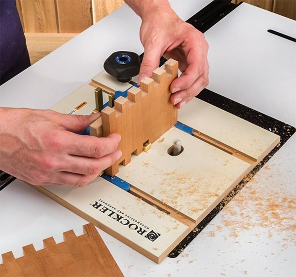 “Using an up-cut spiral bit in a table-mounted router is the best way to cut clean, crisp box joints – without the pointy ‘ears’ left by the angled tips of a saw blade,” said Steve Krohmer, Rockler’s vice president for product development. “The new Rockler Router Table Box Joint Jig provides smooth workpiece motion and precise spacing for perfect box joints.”