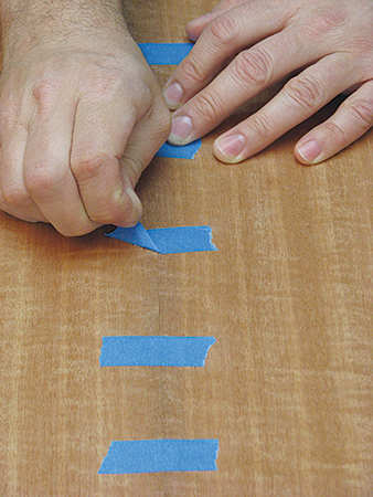 The glue should be relatively heavy but still allow the pencil lines to show through. Apply glue only to the substrate, and spray the veneers with a light mist of water right after laying them over the glue to prevent them from curling. I taped the veneer to the core with blue tape to keep it in place, making sure it protruded slightly beyond the front edge band. The rear edge and ends can be trimmed to final size later.
