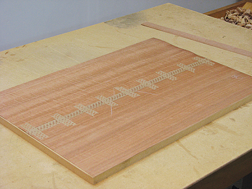 I sanded the MDF core with 120-grit sandpaper to knock off any surface glaze. This is not required when using a Baltic birch core. Then I covered the core with dark pencil lines to give me an idea of how much glue to apply with a 6″-wide glue roller.