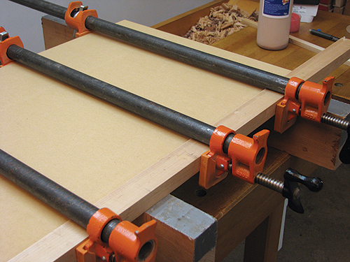 To glue a strip of veneer to the substrate’s edge, make sure it’s a bit oversized and glue it on with clamps. Use a wood clamping caul to better distribute the clamping pressure and to protect the veneer.