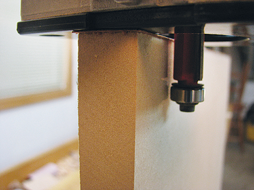I sandwiched my two veneer sheets under a simple jig and on top of a sacrificial piece of 1/4″-thick MDF. By allowing the veneers to protrude slightly from the jig, it was easy to trim the edges with a straight bit in a router. To avoid tearout, given the tiny amount of wood being cut, you can safely climb cut.