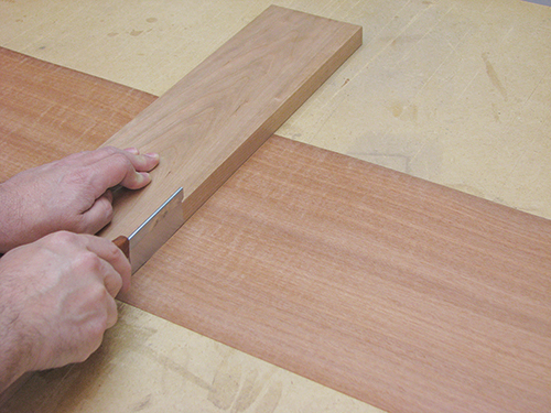 Working with shop-cut veneers isn’t that different, except that you cut them yourself. Start by finding a piece of lumber that has no grain reversals or only very minor ones.