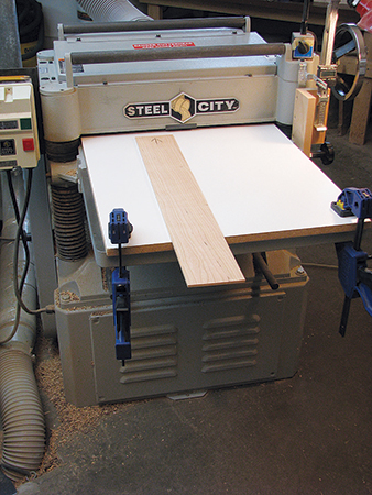 An auxiliary bed (here, a piece of 3/4″ melamine) in your thickness planer lets you plane the bandsawn side of the veneers smooth and to final thickness.