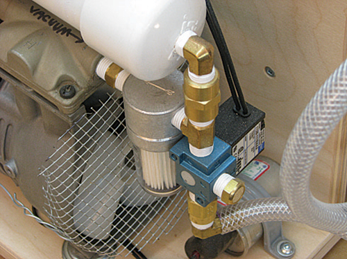 Having helped woodworking students of mine build a vacuum pump set up from a kit, I decided it was time to invest in one myself. I chose a kit with a 3.15 cfm pump, which will handle 4′ x 8′ veneer bags for flat work and 4′ x 4′ bags for moderately curved work. The kit I bought at joewoodworker.com came with all the main parts required. I simply built the wooden stand, supplied the PVC pipe and did a bit of wiring, all according to the detailed plans supplied with the kit. It resulted in a nice, tidy and mobile package.