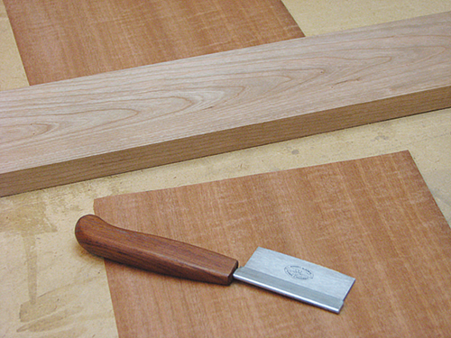 In this article, I’m using commercially cut raw wood veneers in a species called makore. At only 1/42″ thick, only light sanding can be done on the finished panel, not planing or heavy scraping. You can also cut veneer yourself with a good band saw (more about that shortly).