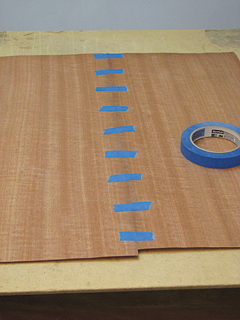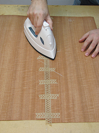 After jointing the edges, I secured the veneers together using blue tape placed across the joint every few inches on the back side. Then I applied veneer tape on the front side, first across the joint and then one long piece along the joint.