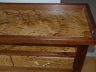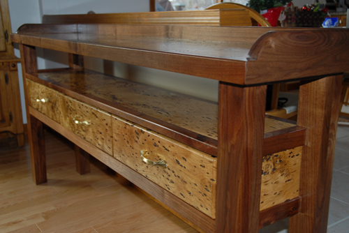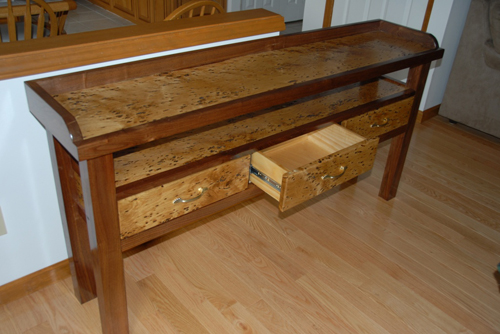 I have a neighbor who works in a lumber mill and he is always on the lookout for any unusual boards as he mills them from the logs. He had previously brought me a couple of pieces of bark in-grown oak. They were 66″ by 12″ by 5/4″ rough. Not even knowing what they would look like I put these boards through the Dewalt which brought out their hidden beauty. It is trimmed out with 1-1/4” Black Walnut. The legs we created by gluing up the Walnut to 2-1/2” x 3″ with the wide side out. Since it is a side or hall table, the legs are 29-1/2” tall.