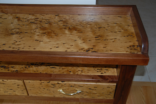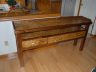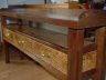 As finished it was 70″ long, 31″ high and 13″ wide. Drawers are 17 1/2″ wide but a foot deep. I used Minwax Natural Stain which evens out the mixed wood colors while not destroying uniqueness of the Oak and Walnut. Top coats were Poly-U.