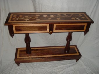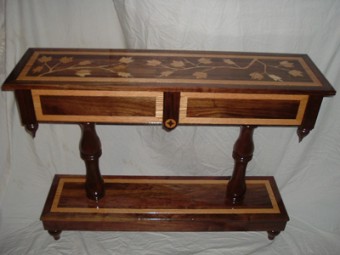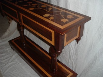 Here are pictures of a Sofa or Console Table made of solid walnut and oak with inlay banding and maple leaves that are a quarter of an inch thick not veneer! The table measures 12″ x 33″ x 36″ The only thing missing are the drawer pulls that my client picked out. The project took seventy hours to complete.