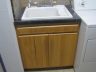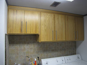 Here are the cabinets I built for my wife. The carcasses are 1/2″ MDF laminated with 1/4″ birch plywood and the doors are 1/2″ MDF laminated with 1/8″ X 3″ red oak stripes and I used 3/4″ x 3/4″ solid oak on all the door edges. The wood was sanded and left unstained, and given 4 coats of satin General Arm-R-Seal. The sink counter top is 70 lbs of concrete, polished with a 90 degree wet grinder using 50-3000 grit diamond polishing pads. The counter top was then sealed with 4 coats of an acrylic sealer.