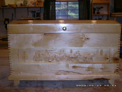 Blanket chest of maple,the carving was made on the carvewright machine. 3 coats of tung oil and 1 poly. –…