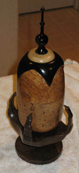This project is of a maple burl egg, hollowed out and placed on a walnut stand that is carved to…