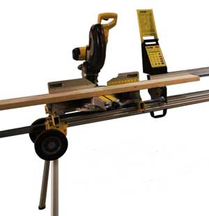 SawGear is a miter saw attachment: you enter your desired dimension into the keypad, put your material against the stop, and cut, with no further adjustment needed.