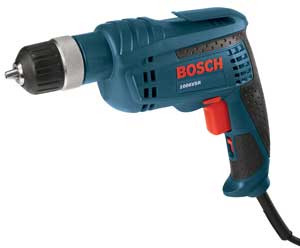 The Bosch 1006VSR 3/8” drill weighs in at 3.4 lbs., with a 6.3-amp motor and dial-in speeds ranging from 0 to 2,600 rpm.