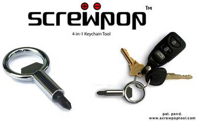 The Screwpop™ 4-in-1 keychain fits on any size keyring and includes a Phillips #2 screwdriver, a #2 flathead screwdriver, a 1/4” hex nut driver and a bottle pop-top opener.