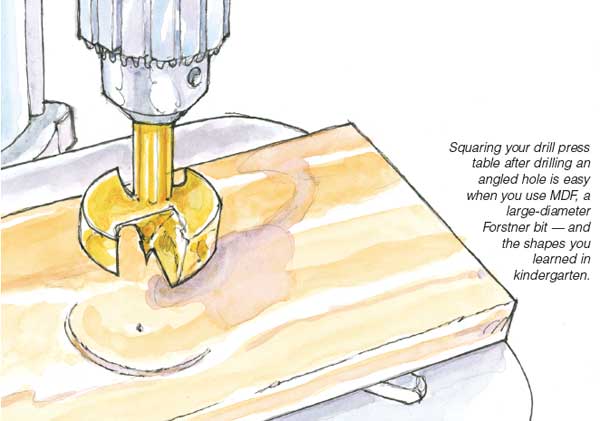 Any time you tip your drill press table off of 90° to bore an angled hole, you’ll need to square the table to the chuck again when you return to normal drilling.