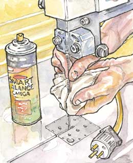 Ordinary cooking spray does a lot more than keep food from sticking. I spray some on a rag and wipe down my band saw blade between uses.