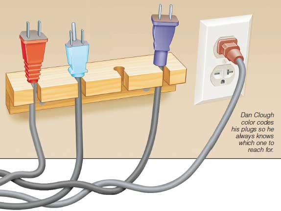 Since outlets are scarce in my shop, four machines have to share one outlet. I got tired of guessing which of the four identical black plugs was the right one for the machine I wanted to use.
