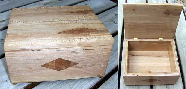 I made this box for my wife for our 12th wedding anniversary this year. The box is primarily Flowering Dogwood. The diamond-shaped inlay on the front panel is Ancient Kauri wood with the wood cut to maximize the chatoyancy.