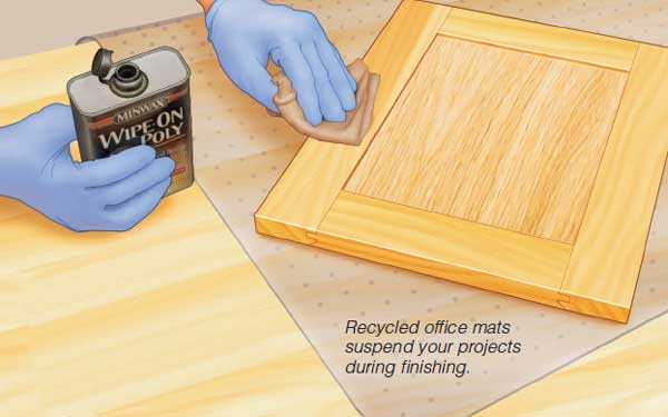 Instead of throwing away the old plastic carpet protector mat under my desk chair, I cut it into squares for use during finishing and gluing.